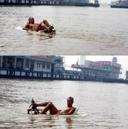 一名60多歲的爹爹仰躺在水中,蹬踩一種自制裝置,身體便能快速地在江面移動。